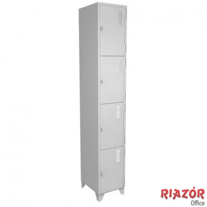 Os Roupeiros de aço da linha RZMT com porta pequena estão disponíveis em 4/8/12/16 portas. A porta vem com pitão de série (dispositivo para cadeado) ou opcional de travamento por fechaduras tipo yale (chave + fechadura), garantindo alta qualidade ao produto. Toda a linha RZMT tem dobras duplas em todo perímetro da porta, possui pé em aço ou opcional em propileno de alto impacto e recebe aplicação de tinta em pó hibrida, sendo que a polimerização ocorre em estufas com temperaturas próximas a 200 graus Celsius, garantindo durabilidade, uniformidade e beleza aos roupeiros. O produto ganha tratamento anti-ferruginoso recebendo desengraxe, proteção fosfática, enxague e aplicação de passivador inorgânico. O armário está 100% de acordo com a NR24.