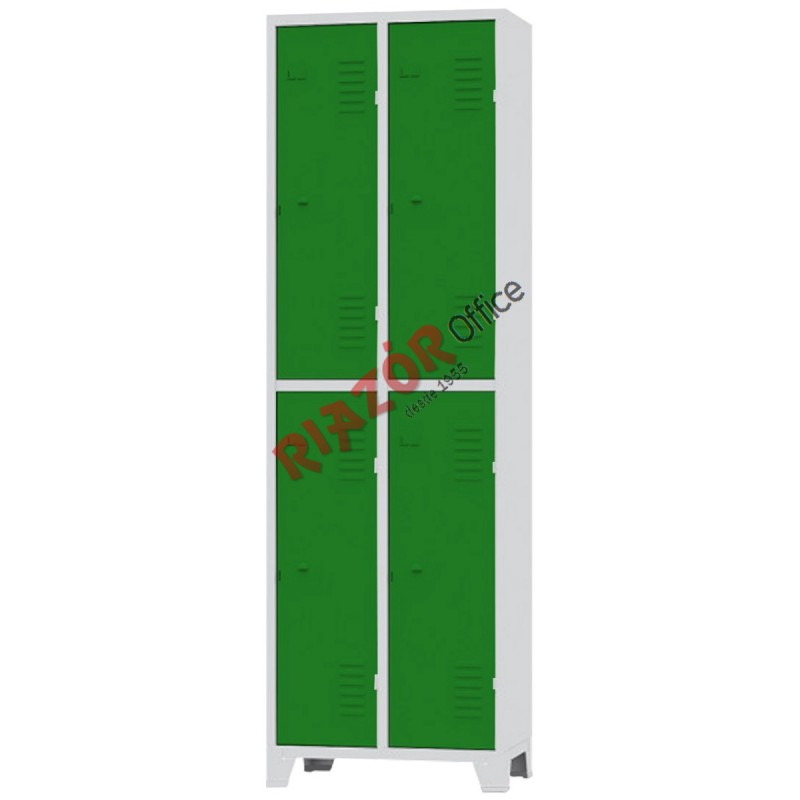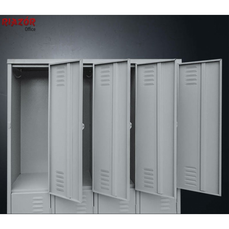 Os Roupeiros de aço da linha RZMT com porta grande estão disponíveis em 2/4/6/8 portas. A porta vem com pitão de série (dispositivo para cadeado) ou opcional de travamento por fechaduras tipo yale (chave + fechadura), garantindo alta qualidade ao produto. Toda a linha RZMT tem dobras duplas em todo perímetro da porta, possui pé em aço ou opcional em propileno de alto impacto e recebe aplicação de tinta em pó hibrida, sendo que a polimerização ocorre em estufas com temperaturas próximas à 200 ºC, garantindo durabilidade, uniformidade e beleza aos roupeiros. O produto ganha tratamento anti-ferruginoso recebendo desengraxe, proteção fosfática, enxague e aplicação de passivador inorgânico. O armário está 100% de acordo com a NR24.