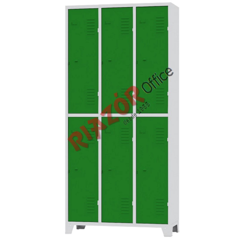 Os Roupeiros de aço da linha RZMT com porta grande estão disponíveis em 2/4/6/8 portas. A porta vem com pitão de série (dispositivo para cadeado) ou opcional de travamento por fechaduras tipo yale (chave + fechadura), garantindo alta qualidade ao produto. Toda a linha RZMT tem dobras duplas em todo perímetro da porta, possui pé em aço ou opcional em propileno de alto impacto e recebe aplicação de tinta em pó hibrida, sendo que a polimerização ocorre em estufas com temperaturas próximas a 200 graus Celsius, garantindo durabilidade, uniformidade e beleza aos roupeiros. O produto ganha tratamento anti-ferruginoso recebendo desengraxe, proteção fosfática, enxague e aplicação de passivador inorgânico. O armário está 100% de acordo com a NR24.
